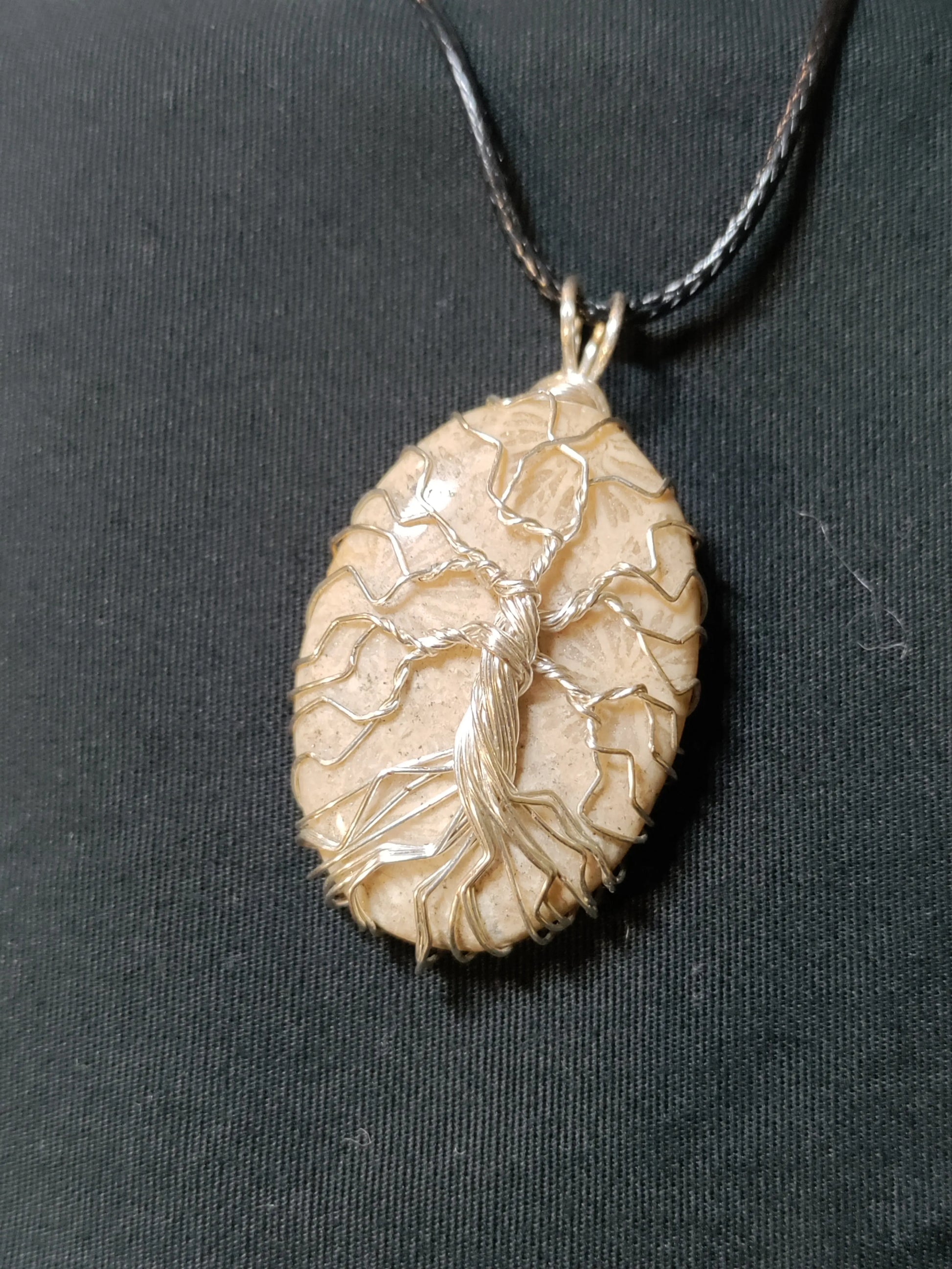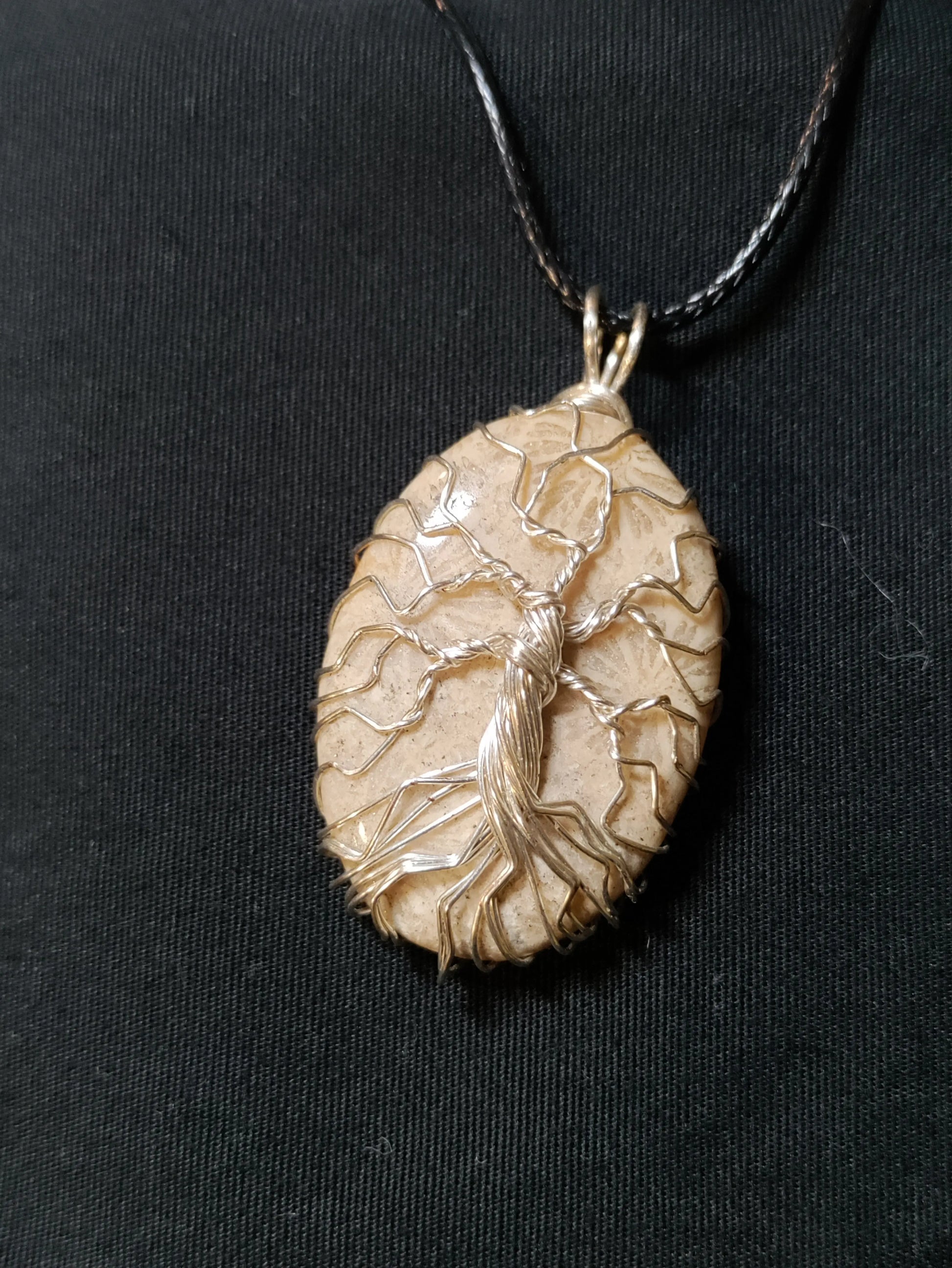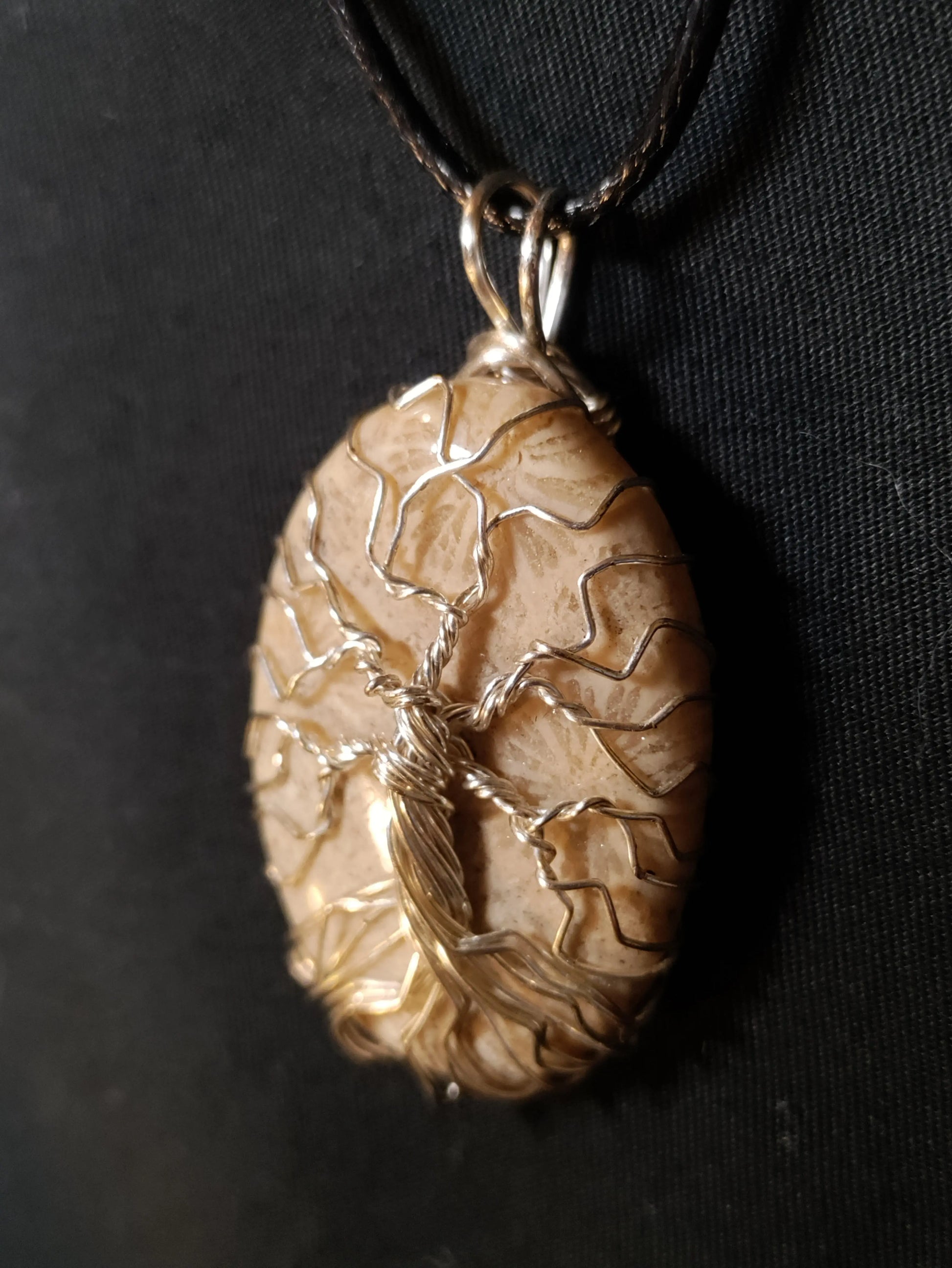 One of a kind, handmade Tree of Life Necklace. Made with a top-quality Fossilized Coral Cabochon and Silver Wire by Leaf's Jewelry. It comes with a simple black necklace and a beautiful, cotton filled, golden jewelry box.
